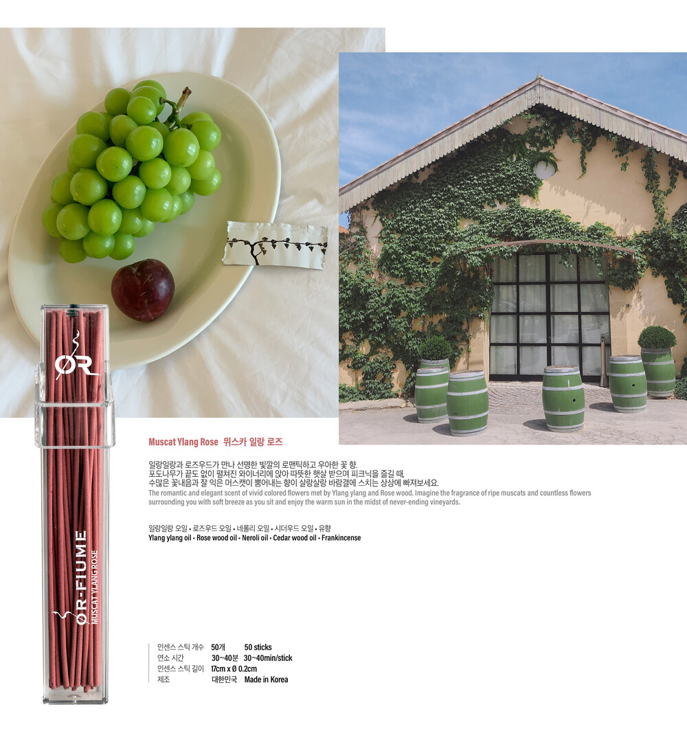 일랑일랑과 로즈우드가 만나 선명한 빛깔의 로맨틱하고 우아한 꽃 향. 포도나무가 끝도 없이 펼쳐진 와이너리에 앉아 따뜻한 햇살 받으며 피크닉을 즐길 때, 수많은 꽃내음과 잘 익은 머스캣이 뿜어내는 향이 살랑살랑 바람결에 스치는 상상에 빠져보세요.